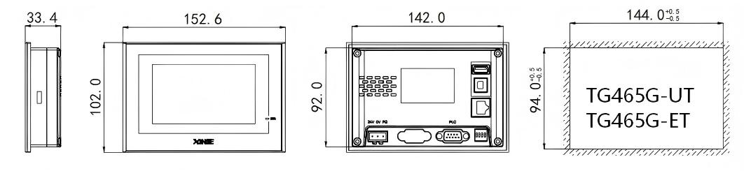 信捷触摸屏,TG薄款,灰色,4.3寸,1677万色,分辨率480*272,400MHz主频,128MB存储器,1个PLC通讯口,支持 RS232/RS485/RS422,USB-B下载方式,1个USB-A口,支持CSV数据导入导出和U盘下载程序,1个以太网接口,支持MODBUS TCP协议;