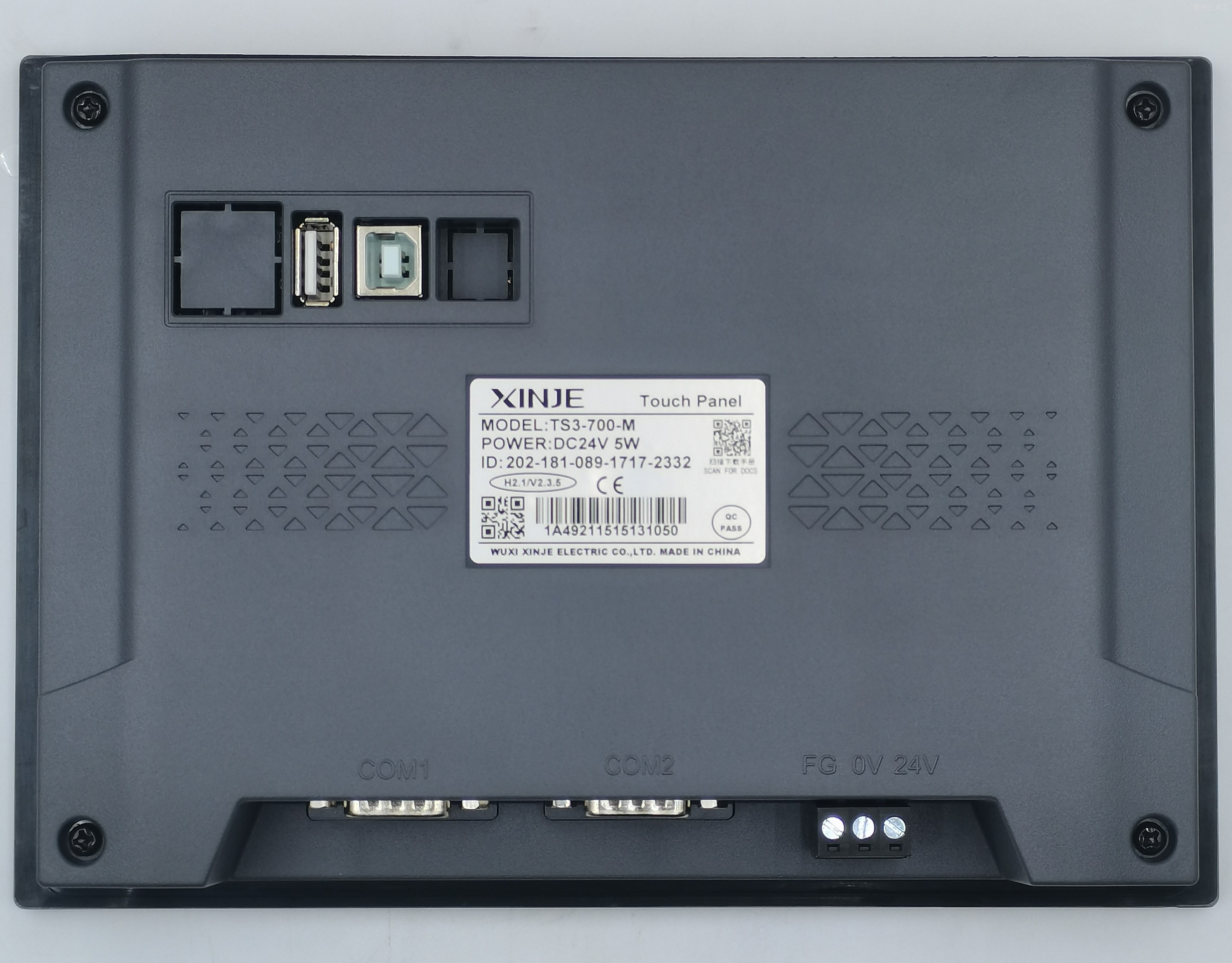 信捷触摸屏,TS3系列7.0寸屏,基于Linux系统,采用Cortex-A8处理器,主频600MHz,内置128MB内存,1677万色,分辨率800*480,2个通讯口,COM1口支持RS232/RS485,COM2口支持RS232/RS485/RS422,USB-B下载方式,1个USB-A口,支持CSV数据导入导出和U盘下载程序;