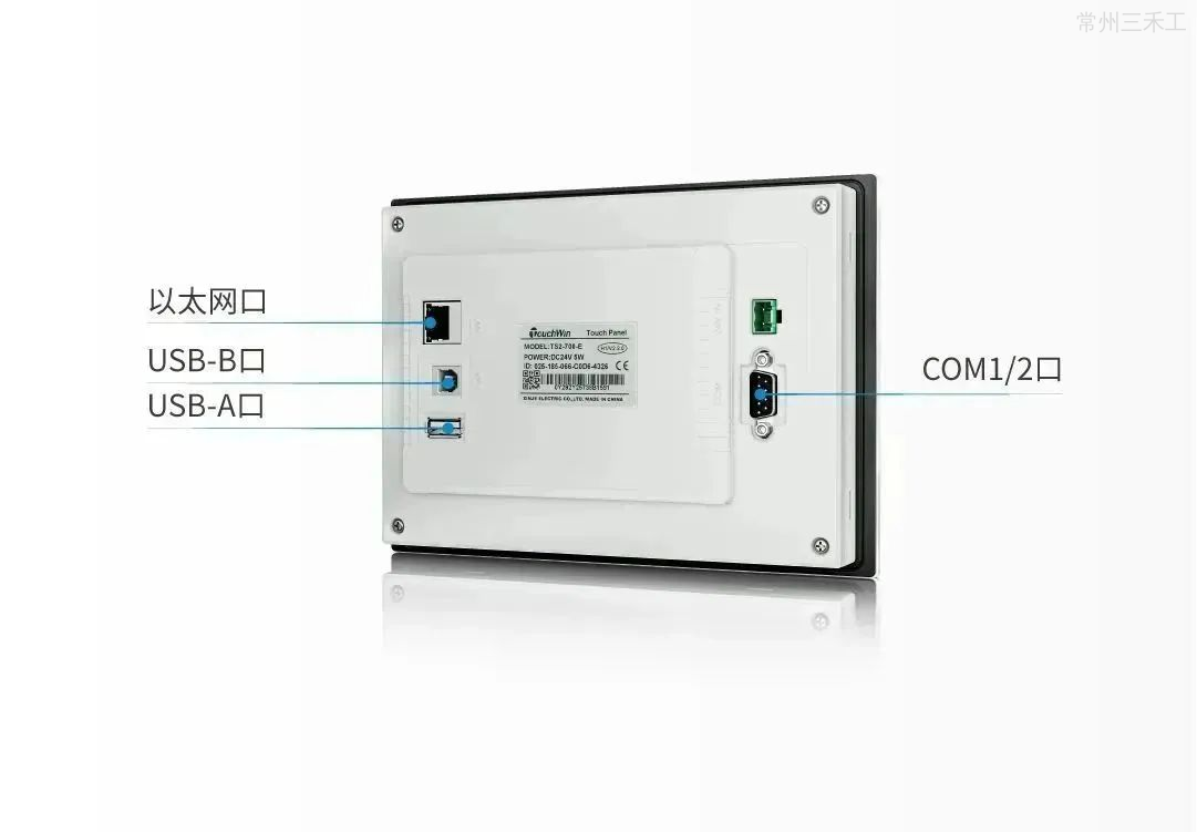 具备RS232与RS485接口,支持连接PLC、伺服、仪表等设备以及微型打印机、串口扫码枪等。