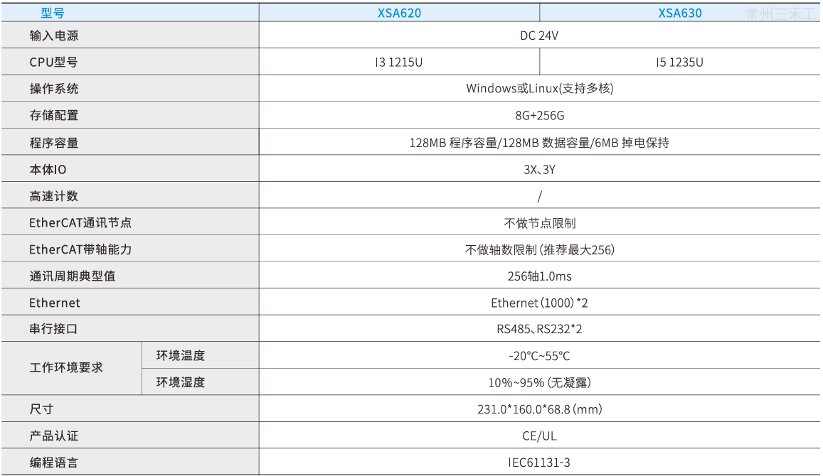 基于CODESYS平台开发,Linux操作系统支持多核,供电电源DC24V,SSD:256G,CPU:12代1215U,RAM:8G,3X(NPN/PNP型输入)、3Y(NPN型),本体带有2个RS232,2个RS485口以及2个EtherNet口和2个EtherCAT口,2个USB2.0:可用于外接鼠标和键盘,2个USB3.0:高速传输数据,支持模拟仿真以及在线下载功能;带轴能力:128轴/1ms;支持双EtherCAT网口带轴;