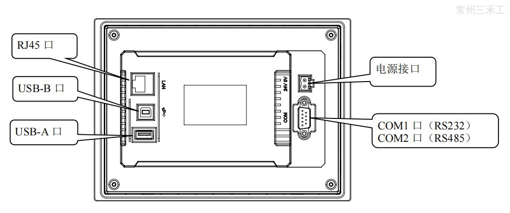 ![]() | 以太网接口 | 连接网线上/下载 HMI 程序,支持与信捷、西门子、三菱等网口设备,以及其它 Modbus-TCP 设备通讯 |