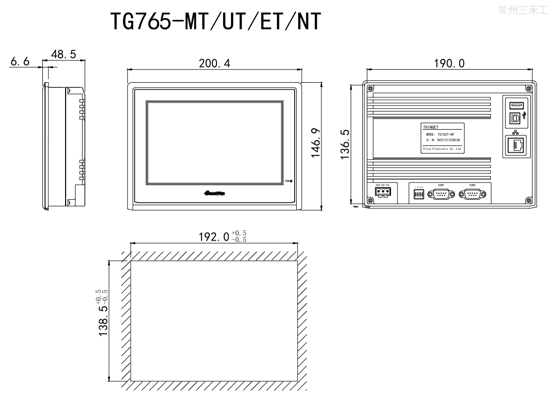 信捷触摸屏,TG老款,黑色,7.0寸,1677万色,分辨率800*480,400MHz主频,128MB存储器,2个通讯口,支持 X-Net 总线(仅单屏模式,最高波特率为115200),PLC口支持RS232/RS485/RS422,Download口支持 RS232/RS485,USB-B下载方式;开孔尺寸:192.0*138.5,可垂直安装;