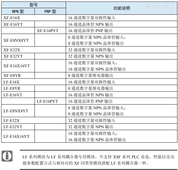 信捷远程IO模块,LF系列耦合器专用模块;扩展8点直流输入/8点晶体管输出,正负逻辑可设,输入滤波时间可调,供电电源DC24V,NPN输入,NPN输出;