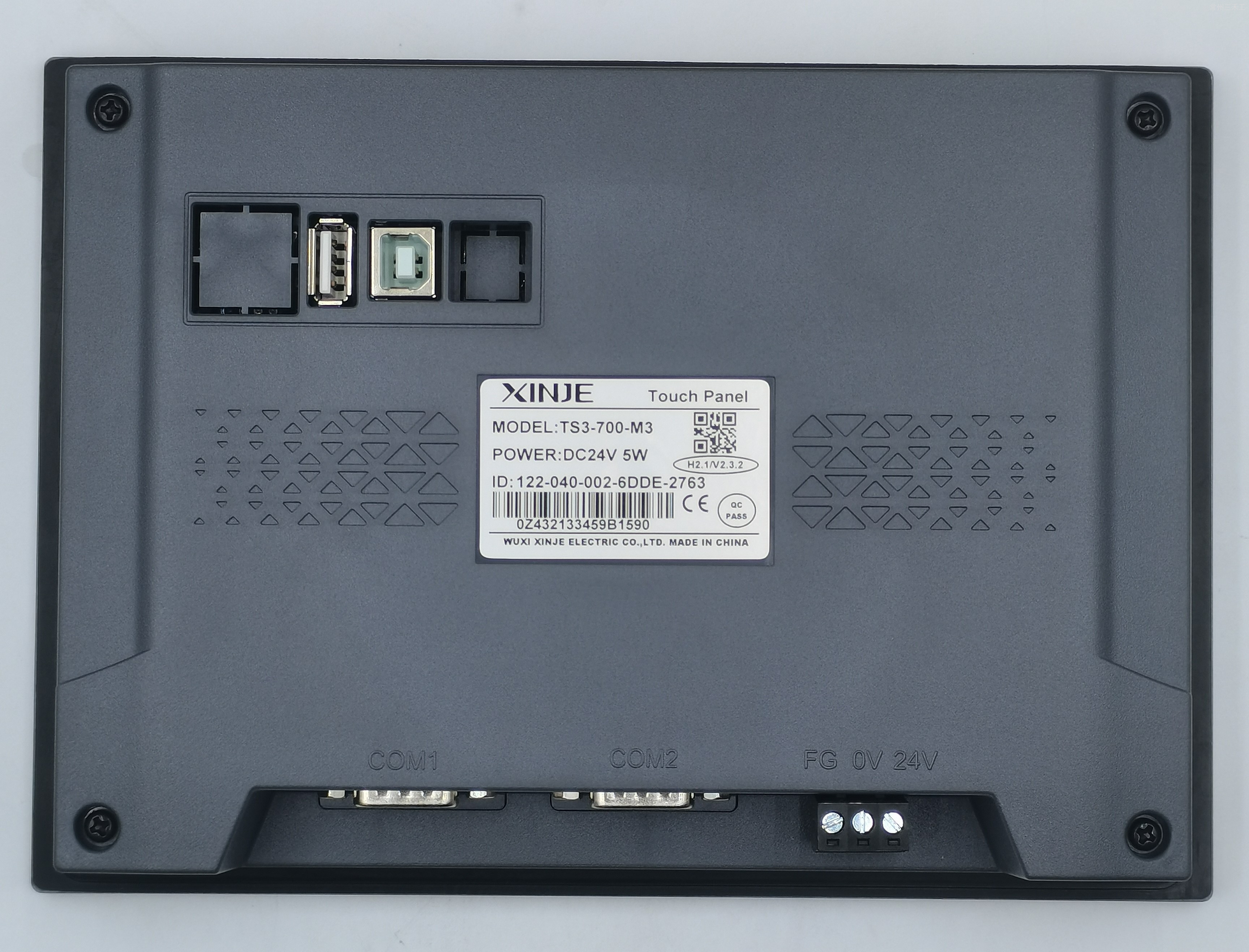 信捷触摸屏,TS3系列7.0寸屏,基于Linux系统,采用Cortex-A8处理器,主频600MHz,内置128MB内存,1677万色,分辨率800*480,3个通讯口,COM1口支持RS232/RS485,COM2口支持RS232/RS485/RS422,COM3支持RS485,USB-B下载方式,1个USB-A口,支持CSV数据导入导出和U盘下载程序;