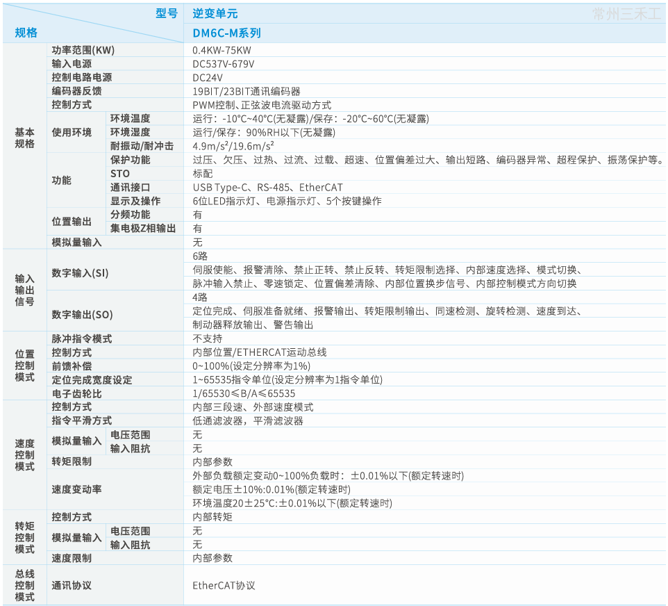 信捷伺服驱动器,EtherCAT总线型多机传动伺服驱动器6输入4输出,输出电流62.5A,详情请下载DM6C系列伺服驱动器用户手册