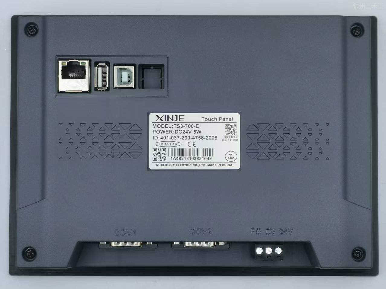 信捷触摸屏,TS3系列7.0寸屏,基于Linux系统,采用Cortex-A8处理器,主频600MHz,内置128MB内存,1677万色,分辨率 800*480,2个通讯口,COM1口支持RS232/RS485,COM2口支持RS232/RS485/RS422,USB-B下载方式,1个USB-A口,支持CSV数据导入导出和U盘下载程序,1个以太网接口,支持MODBUS TCP协议,支持网口下载;